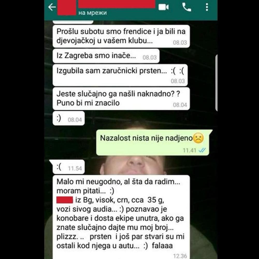 Ćao, prošlu subotu smo frendice i ja bili na djevojačkoj u vašem klubu… Iz Zagreba smo inače… Izgubila sam zaručnički prsten…  Jeste slučajno ga našli naknadno? Puno bi mi značilo. :)Na njenu žalost, u klubu nije pronađen prsten, ali je zato potom na videlo isplivala cela istina:Malo mi je neugodno, ali šta da radim.