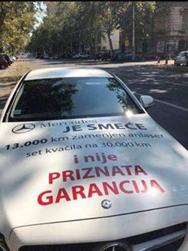 Dodatne “informacije” besni vlasnik ispisao je i na haubi svoje nove “moćne mašine”. Uz istu poruku, “mercedes je smeće”. on je dopisao: “13.000 km zamenjen alnaser, set kvačila na 30.000 km, NE PODLEŽE GARANCIJI”.