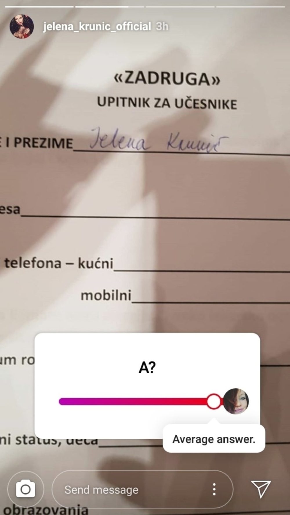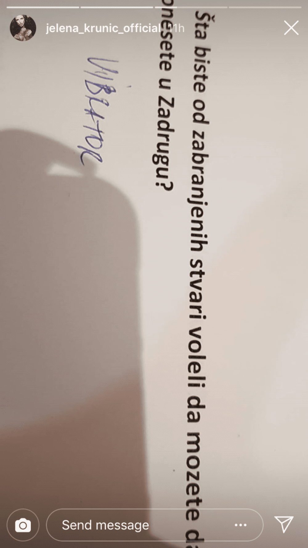 Jelena je na svom Instagram profilu slikala kako popunjava ugovor za “Zadrugu”. Jedno od pitanja bilo je “šta biste od zabranjenih stvari voleli da možete da unesete u Zadrugu”, a Kurnićkin odgovor bio je krajnje maštovit.