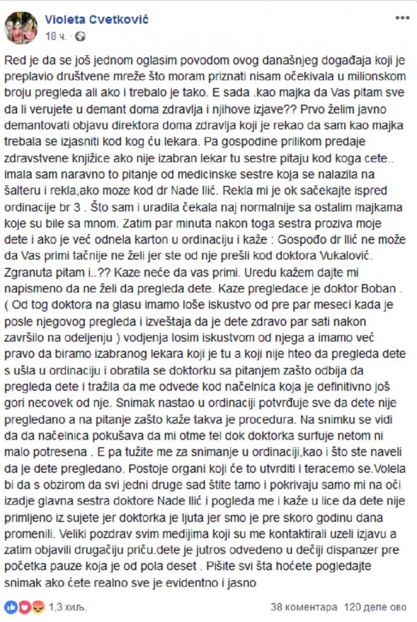 E pa tužite me za snimanje u ordinaciji, kao i što ste naveli da je dete pregledano. Postoje organi koji će to utvrditi i teraćemo se. Volela bih da, s obzirom da svi jedni druge sad štite tamo i pokrivaju, mi samo na oči izađe glavna sestra doktorke Nade Ilić i pogleda me i kaže u lice da dete nije primljeno iz sujete, jer doktorka je ljuta jer smo je pre skoro godinu dana promenili. Veliki pozdrav svim medijima koji su me kontaktirali uzeli izjavu a zatim objavili drugačiju priču. Dete je jutros odvedeno u dečiji dispanzer pre početka pauze koja je od pola deset. Pišite svi šta hoćete pogledajte snimak ako ćete realno sve je evidentno i jasno ” napisala je majka deteta, Violeta Cvetković.