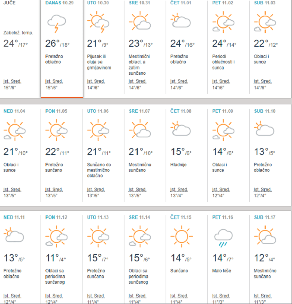 Evo kakvo nas vreme očekuje u narednom periodu! Prema sezonskoj prognozi, u novembru će srednja maksimalna prosečna dnevna temperatura biti iznad višegodišnjeg proseka, pa bi novembar trebalo da bude topliji nego što je uobičajeno i prosečno suv.