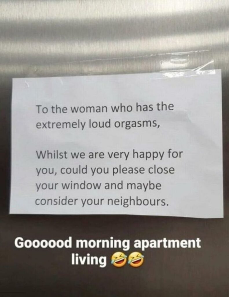 Ako živite u stanu, znate da je puno stvari teško sakriti od komšija. Često čujete šta gledate na televiziji kada povisite glas, ali morate biti oprezni i kada razmenite nežnost sa partnerom.U zgradi u Australiji pojavila se poruka za komšiju koji ima vrlo glasan orazam.