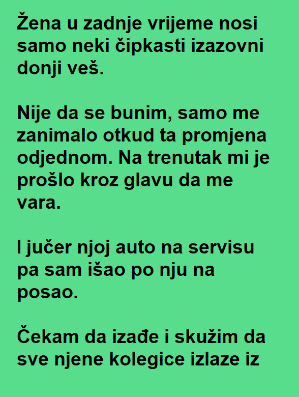 Žena u zadnje vrijeme nosi samo neki čipkasti izazovni donji veš. Nije da se bunim, samo me zanimalo otkud ta promjena odjednom. Na trenutak mi je prošlo kroz glavu da me vara. I jučer njoj auto na servisu pa sam išao po nju na posao.