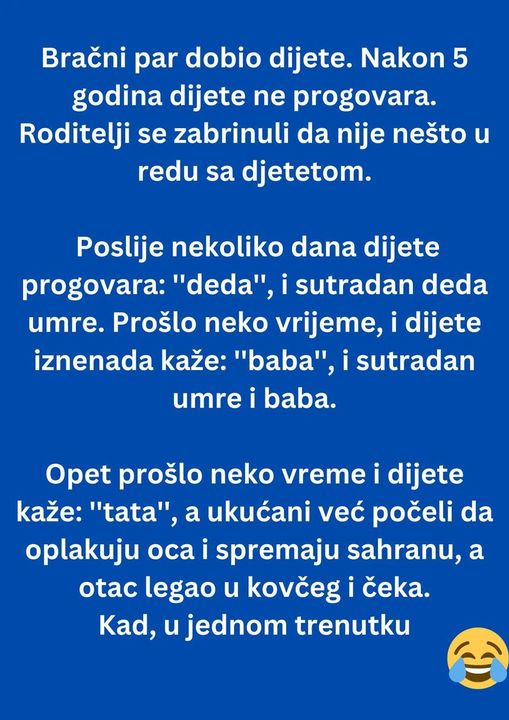 Bračni par dobio dijete. Nakon 5 godina dijete ne progovara. Roditelji se zabrinuli da nije nešto u redu sa djetetom. Poslije nekoliko dana dijete progovara: ”deda”, i sutradan deda umre. Prošlo neko vrijeme, i dijete iznenada kaže: ”baba”, i sutradan umre i baba.