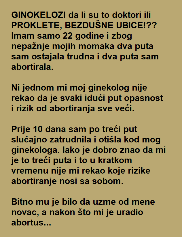 Teške komplkacije, hitne operacija i samo par sati nakon abortusa meni je bilo sve povađeno tamo dole. NIKADA VIŠE NEĆU MOĆI DA ZATRUDNIM… NIKADA NEĆU BITI MAMA… a sve zbog PROKLETOG BEZDUŠNOG doktora kome je bitan samo novac. Izvor : Novi.ba