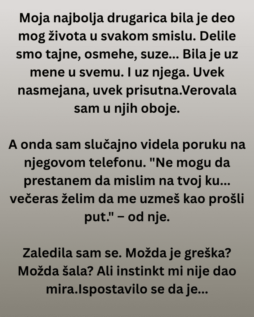 Moja najbolja drugarica bila je deo mog života u svakom smislu. Delile smo tajne, osmehe, suze… Bila je uz mene u svemu. I uz njega. Uvek nasmejana, uvek prisutna.