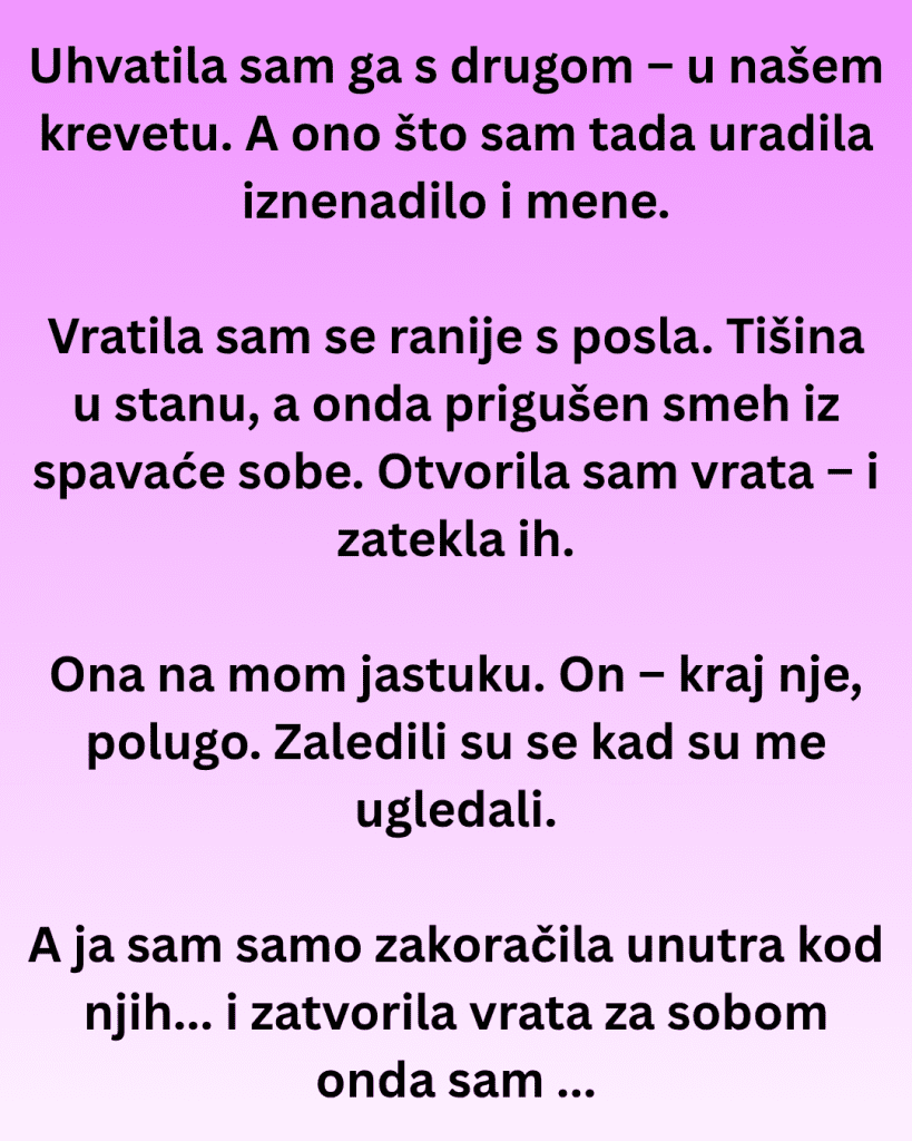 Vratila sam se ranije s posla. Tišina u stanu, a onda prigušen smeh iz spavaće sobe. Otvorila sam vrata – i zatekla ih.