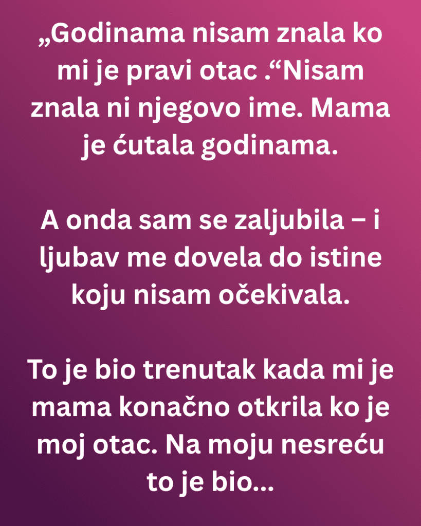 Nikada nisam imala pravog odgovor kad bih pitala za oca. Mama bi uvek izbegla priču – govorila je da je bio prolaznik, greška iz mladosti, nešto što je bolje zaboraviti. Naučila sam da ne postavljam previše pitanja.