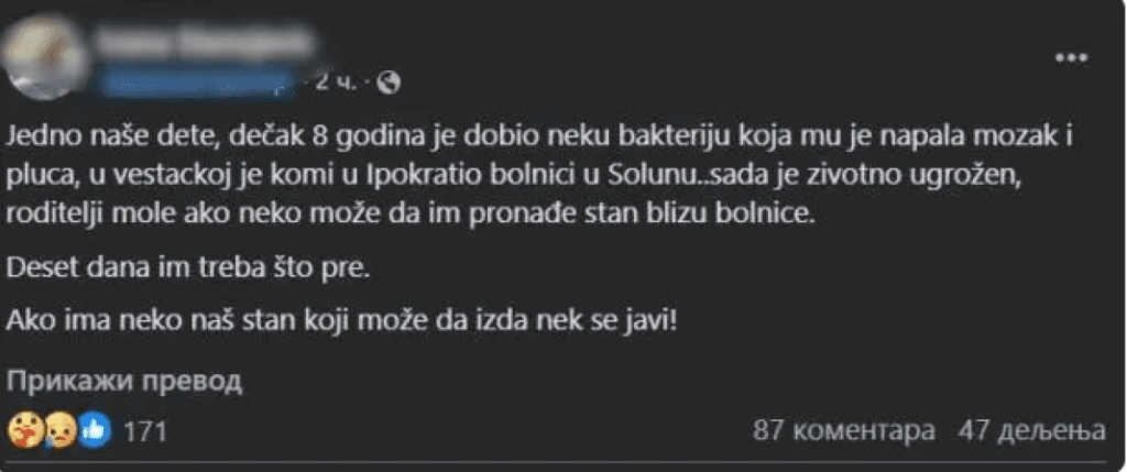 Jedno naše dete, dečak 8 godina je dobio neku bakteriju koja mu je napala mozak i pluća, u veštačkoj je komi u Ipokratio bolnici u Solunu.. sada je životno ugrožen, roditelji mole ako neko može da im pronađe stan blizu bolnice. Deset dana im treba što pre. Ako ima neko naš stan koji može da izda nek se javi! – glasi objava.