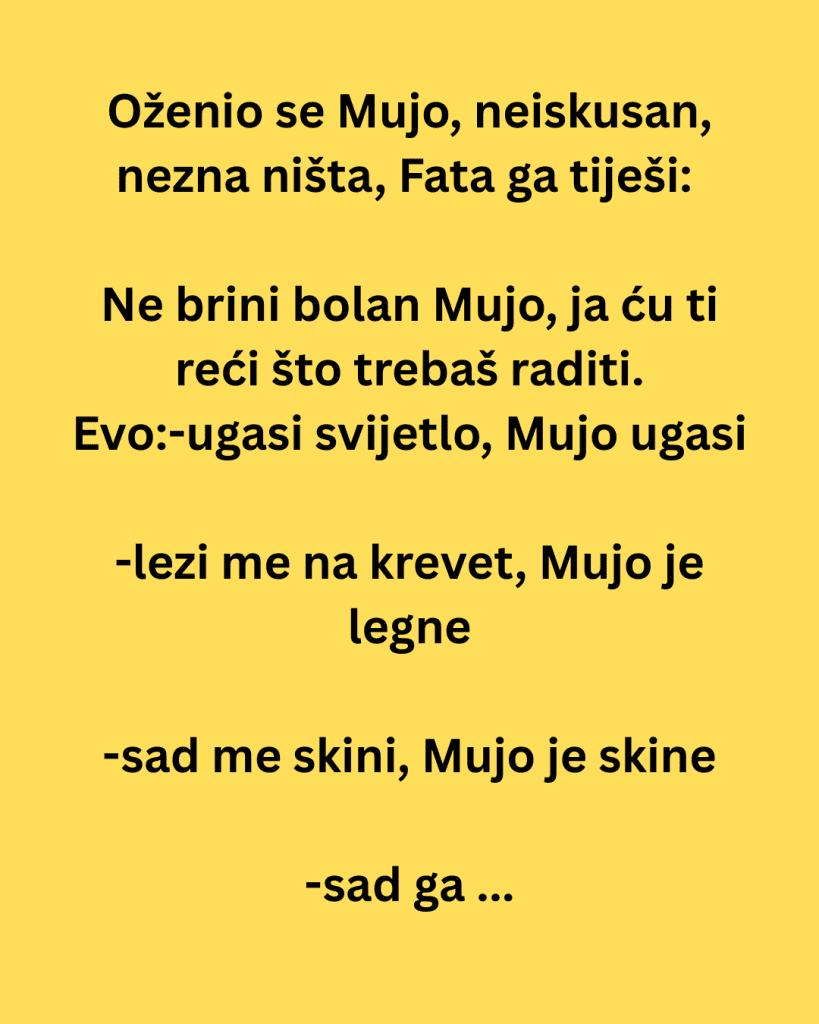 Oženio se Mujo, neiskusan, nezna ništa, Fata ga tiješi: Ne brini bolan Mujo, ja ću ti reći što trebaš raditi.Evo: