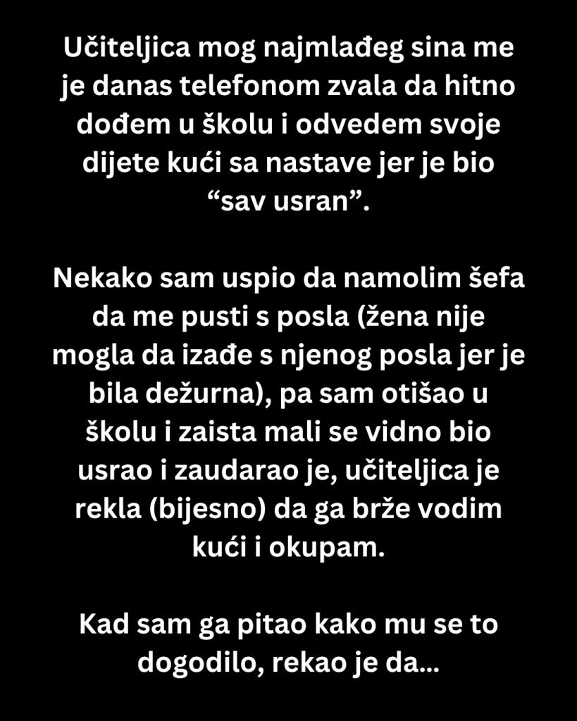 Danas me je iznenada pozvala učiteljica mog najmlađeg sina. Glas joj je bio ozbiljan i rekla je da odmah dođem po dijete jer je “sav us*an”. Na poslu sam se jedva izborio da me šef pusti – žena nije mogla da izađe jer je bila dežurna – pa sam ja otrčao u školu.