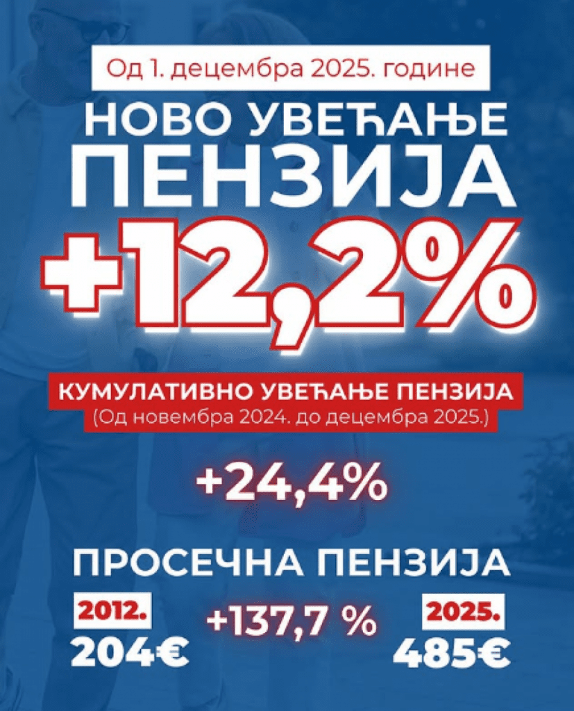 Iz Fonda PIO ističu da treba podsetiti građane da je kumulativno uvećanje penzija od novembra 2024. godine do decembra 2025. godine 24,4 odsto.