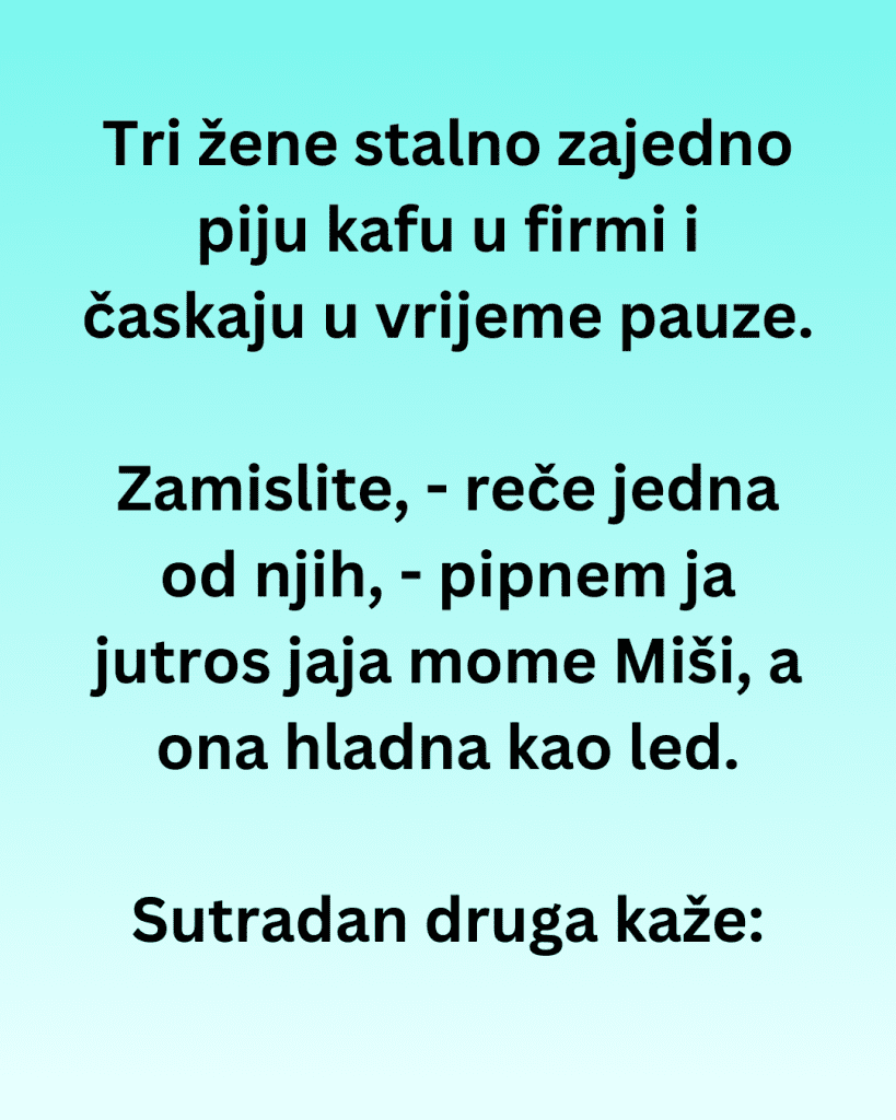 Sutradan druga kaže: - Provjerila sam: i mome Milanu su isto ledena jaja. Baš je to čudno!