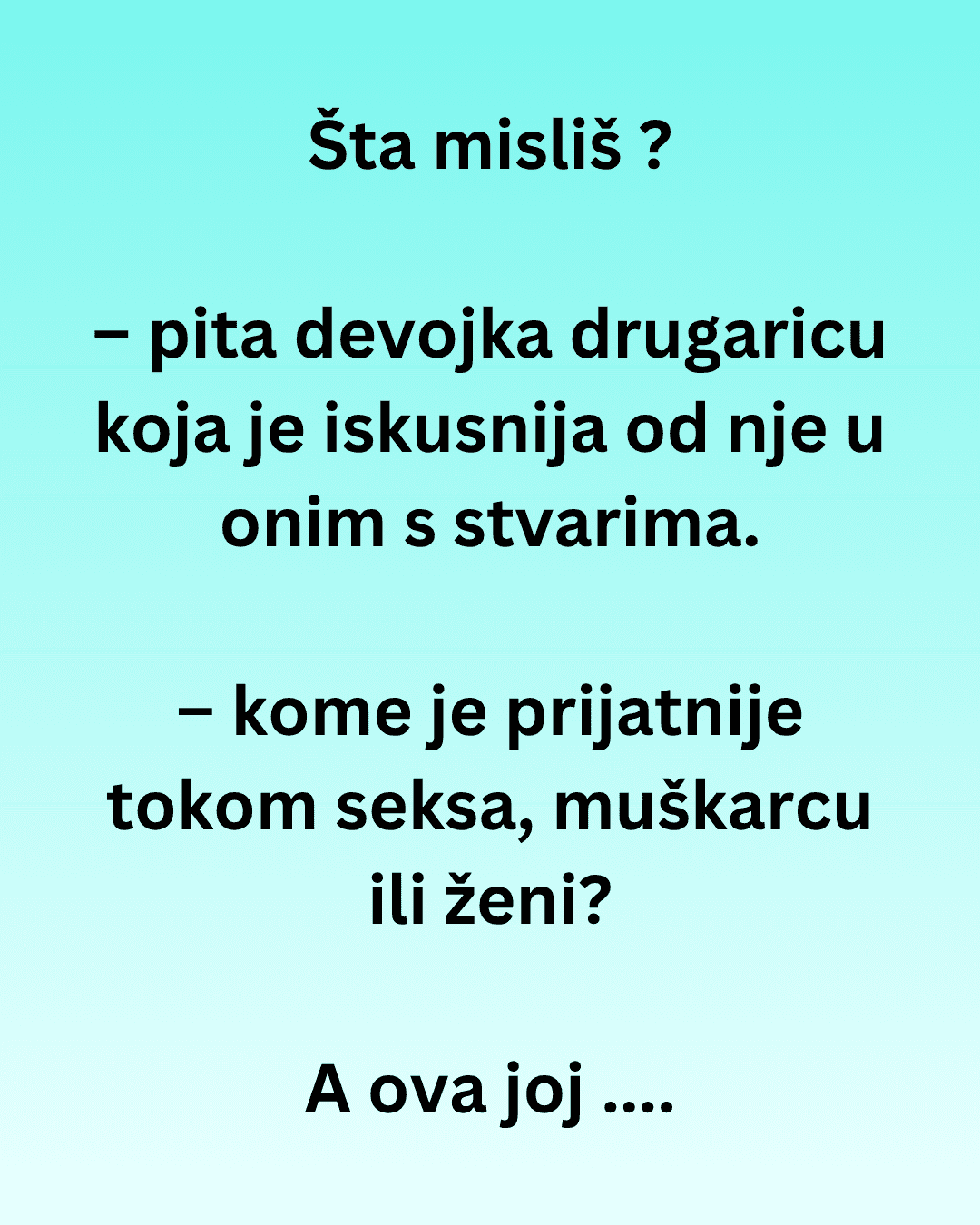 - Šta misliš – pita devojka drugaricu koja je iskusnija od nje u onim s– kome je prijatnije tokom seksa, muškarcu ili ženi?