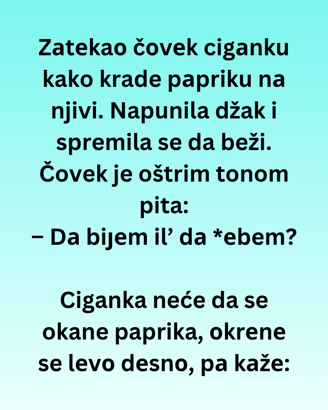Zаtеkaо čоvеk cigаnku kako krade pаpriku nа njivi. Napunila džak i spremila se da beži. Čovek je oštrim tonom pita: