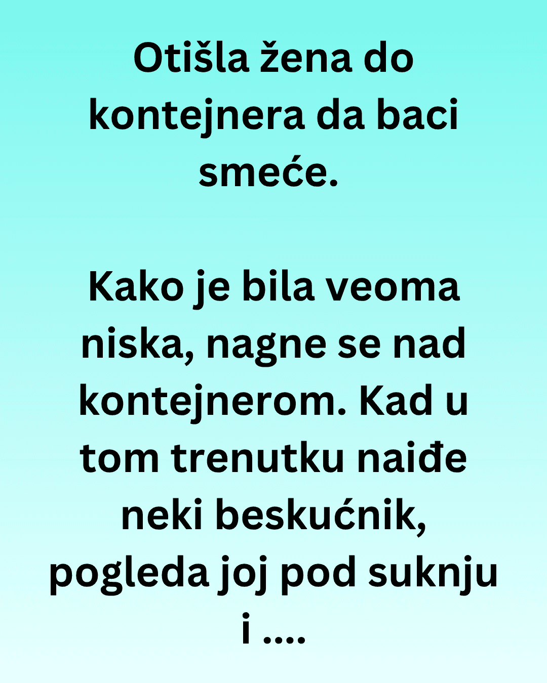 Otišla žena do kontejnera da baci smeće. Kako je bila veoma niska, nagne se nad kontejnerom. Kad u tom trenutku naiđe neki beskućnik, pogleda joj pod suknju, prebaci je preko ramena i prokomentariše onako za sebe: