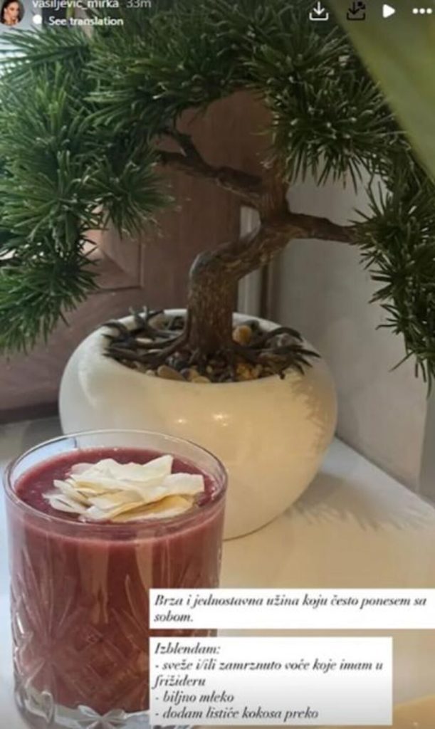 - Brza i jednostavna užina koju često ponesem sa sobom. Izblendam: Sveže i/ili zamrznuto voće koje imam u frižideru, biljno mleko, dodam listiće kokosa preko – napisala je Mirka u opisu fotografije.