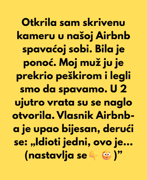 U 2 ujutro vrata su se naglo otvorila. Vlasnik Airbnb-a je upao bijesan, vičući: „Idioti jedni, to je kamera za vanjski nadzor! Zašto ste je prekrili?“