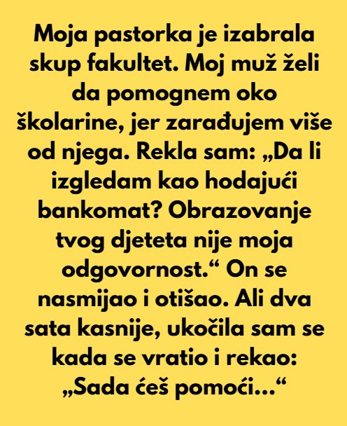 Mila će uskoro na fakultet i izabrala je jako skup. Moj muž želi da mu pomognem oko plaćanja školarine jer zarađujem više od njega. Nikada prije nije tražio da platim išta što se tiče nje, ali pretpostavljam da je fakultet nešto za šta mu je stvarno trebala moja pomoć.