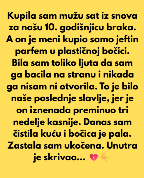 Mesecima sam štedela da mu kupim sat iz snova za našu 10. godišnjicu braka. Došao je taj dan, a sve što mi je on poklonio bio je jeftin parfem u plastičnoj bočici. Bila sam toliko ljuta da sam ga bacila u stranu i nikada ga nisam ni otvorila. To je bilo naše poslednje slavlje, jer je on iznenada poginuo u saobraćajnoj nesreći tri nedelje kasnije.