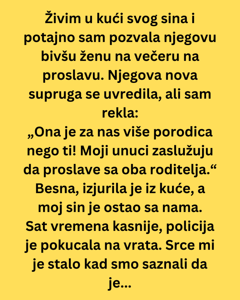 Živim u kući svog sina i potajno sam pozvala njegovu bivšu ženu na večeru za Dan zahvalnosti. Njegova nova supruga se uvredila, ali sam rekla: