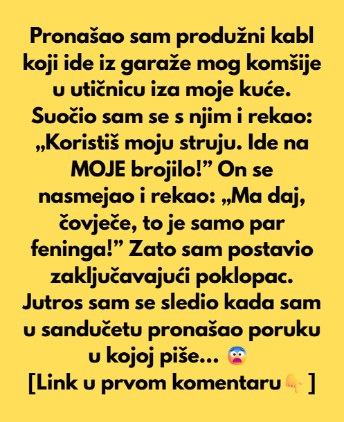 Onda sam ga uhvatio da to ponovo radi. Prišao sam mu mirno i rekao: „Brate, ti koristiš moju struju, to ide na MOJ brojilo!” On se samo nasmejao i rekao: „Ma hajde, čovječe. To je samo par feninga!”