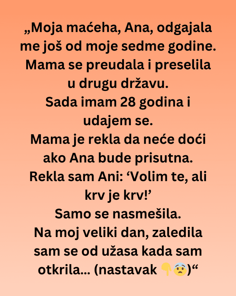 Moja maćeha, Ana, odgajala me od moje sedme godine. Moja mama se preudala i preselila u drugu saveznu državu. Sada imam 28 godina i udajem se. Moja mama mi je rekla da neće doći na svadbu ako bude prisutna i Ana. Rekla sam Ani: „Volim te, ali krv je krv.“ Ona se samo nasmešila.