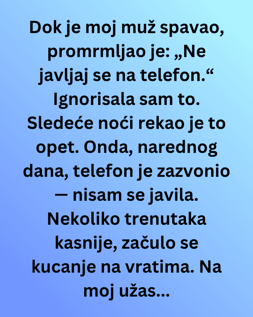 Jedne noći, dok je moj muž spavao, promrmljao je: „Ne javljaj se na telefon.“ Odbacila sam to, pretpostavivši da samo sanja. Sledeće noći rekao je to ponovo — iste reči, istim tonom.