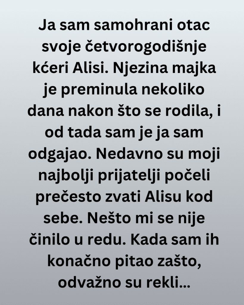 Ja sam samohrani otac svoje četvorogodišnje kćeri Alisi. Njena majka je preminula nekoliko dana nakon njenog rođenja i od tog trenutka život mi se preokrenuo. Vaspitavanje deteta potpuno sam, u ranim dvadesetim, nije bilo lako, ali Alisa je postala moj razlog, moj svet i moja snaga. Sve sam radio da joj ništa ne nedostaje i mislio sam da znam svaki njen korak, svaku naviku, svaki izraz lica.
