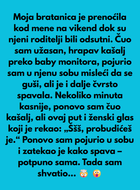 Upravo sam se smestio da spavam kada sam preko monitora čuo užasan, hrapav kašalj. Pojurio sam u njenu sobu misleći da se guši, ali je čvrsto spavala. Nekoliko minuta kasnije ponovo sam čuo kašalj, ali ovog puta i ženski glas koji je rekao: