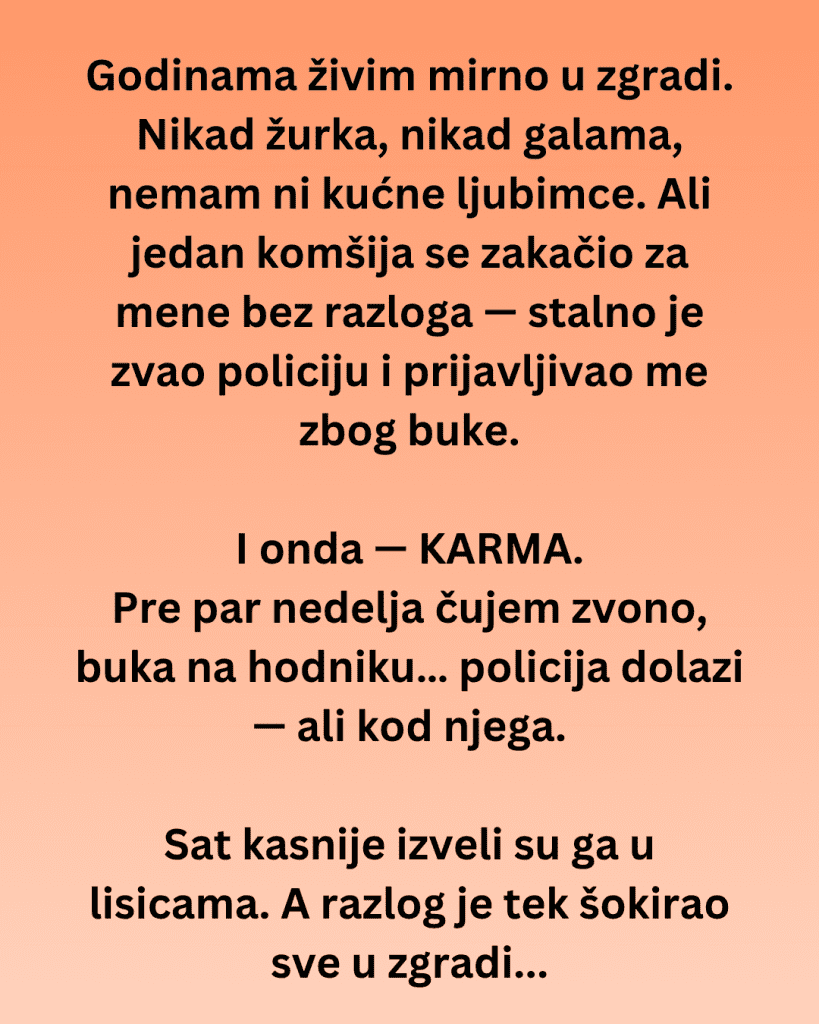Pre tri nedelje čujem galamu na hodniku, zvono na vratima, i policija ulazi… ali ne kod mene, nego kod njega!