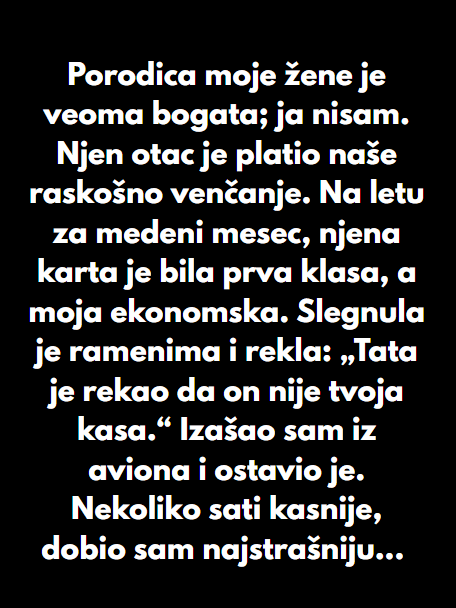Kada smo ušli u avion za medeni mesec, ona je sela u prvu klasu, a ja sam shvatio da je moja karta bila ekonomska. Slegnula je ramenima i rekla: „Bezveze, dušo, ali tata kaže da nije tvoja kasa.” Besan, izašao sam iz aviona.