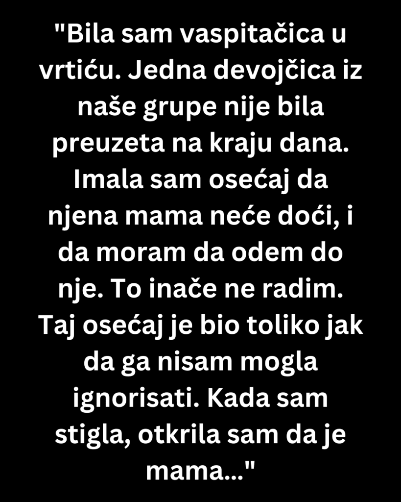 Tog dana ostala je poslednja u vrtiću. Sat je već prošao radno vreme, a njena mama se nije pojavila. Pozvala sam je nekoliko puta, ali se niko nije javljao. Imala sam osećaj u stomaku — kao da nešto nije u redu. Taj osećaj nije bio racionalan, ali bila sam toliko uznemirena da sam jednostavno MORALA da odem do njihove kuće.