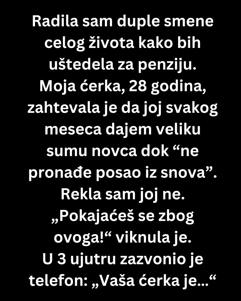 Radila sam duple smene celog života kako bih uštedela za penziju. Moja ćerka, koja ima 28 godina, zahtevala je da joj svakog meseca dajem veliku sumu novca dok “ne pronađe posao iz snova”. Rekla sam joj ne. „Pokajaćeš se zbog ovoga!“ viknula je.