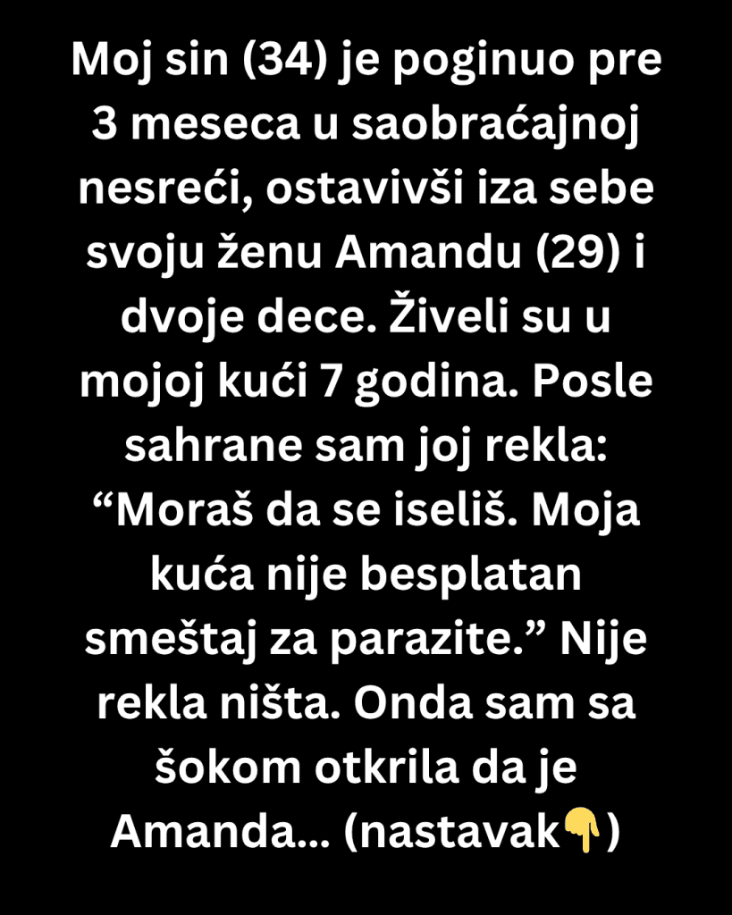Moj sin (34) je poginuo pre 3 meseca u saobraćajnoj nesreći, ostavivši iza sebe svoju ženu Amandu (29) i dvoje dece. Živeli su u mojoj kući 7 godina. Posle sahrane sam joj rekla: “Moraš da se iseliš. Moja kuća nije besplatan smeštaj za parazite.” Nije rekla ništa.