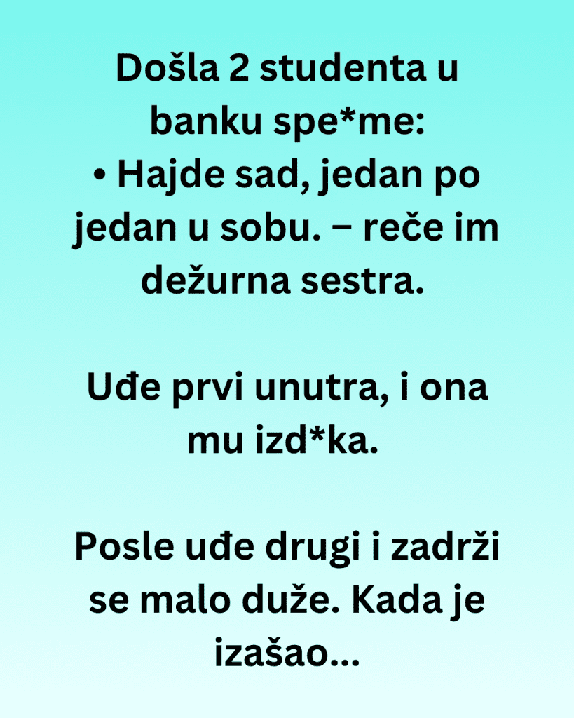 Došla 2 studenta u banku spe*me:• Hajde sad, jedan po jedan u sobu. – reče im dežurna sestra. Uđe prvi unutra, i ona mu izd*ka. Posle uđe drugi i zadrži se malo duže. Kada je izašao, kolega ga pita.