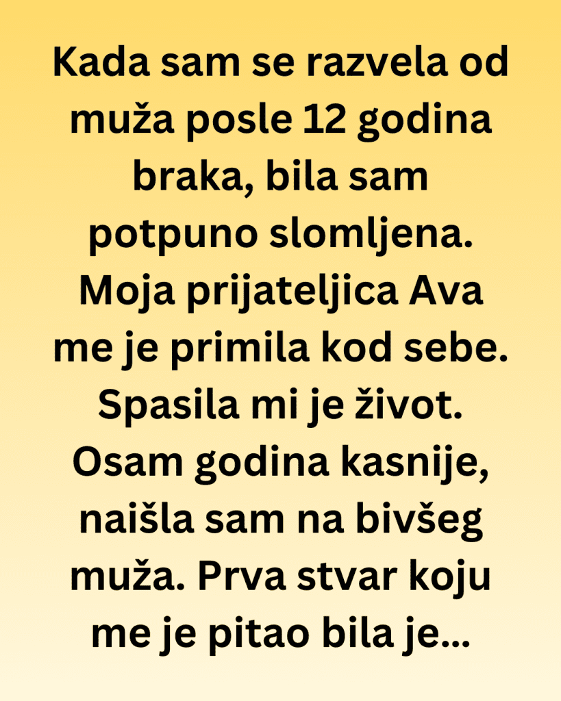 Kada sam se razvela od muža posle 12 godina braka, bila sam potpuno slomljena. Moja prijateljica Ava me je primila kod sebe. Spasila mi je život.