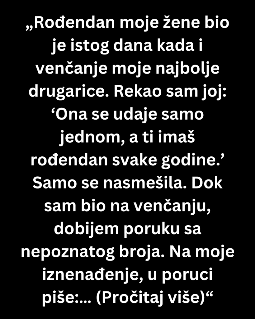 Moja žena je nedeljama planirala proslavu svog 37. rođendana. Problem? Moj najbolji prijatelj se ženio istog dana. Više puta sam je pitao da li može da pomeri žurku, ali je rekla ne — to je njen rođendan i taj datum joj je važan.