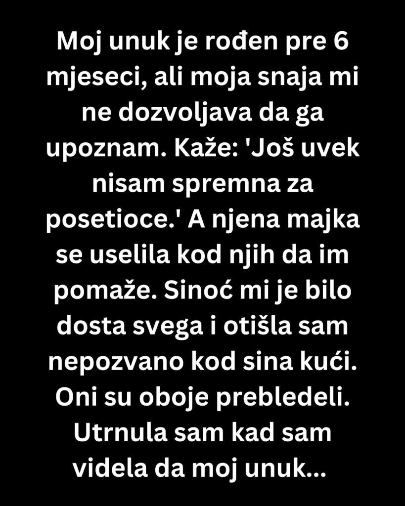 Moj prvi unuk je rođen pre šest meseci, ali moja snaja mi još uvek ne dozvoljava da ga upoznam. Stalno govori: „Još nisam spremna za posetioce.“ Nisam čak ni fotografiju videla — a njena majka se uselila da im pomaže.