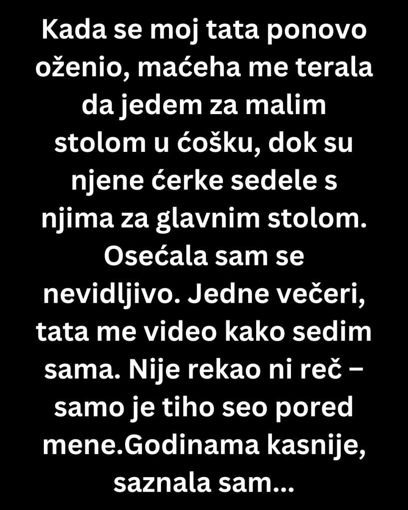 Kada se moj tata ponovo oženio, maćeha me terala da jedem za malim stolom u ćošku, dok su njene ćerke sedele s njima za glavnim stolom. Osećala sam se nevidljivo. Jedne večeri, tata me video kako sedim sama. Nije rekao ni reč – samo je tiho seo pored mene.