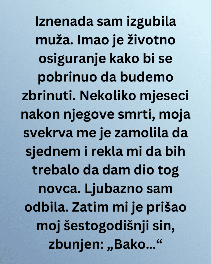 Iznenada sam izgubila muža. Imao je životno osiguranje kako bi se pobrinuo da budemo zbrinuti. Nekoliko mjeseci nakon njegove smrti, moja svekrva me je zamolila da sjednem i rekla mi da bih trebalo da dam dio tog novca. Ljubazno sam odbila. Zatim mi je prišao moj šestogodišnji sin, zbunjen: