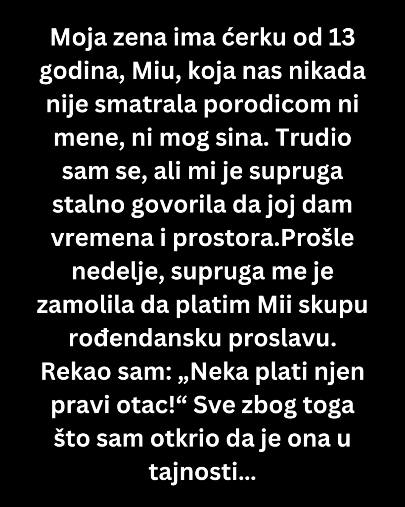 Moja supruga ima ćerku od 13 godina, Miu, koja nikada nije smatrala mene i mog sina porodicom. Trudio sam se, ali mi je supruga govorila da joj dam prostora. Prošle nedelje, supruga me zamolila da platim Mijin skupi rođendan. Odbio sam. Rekao sam: „Neka plati njen pravi otac!“