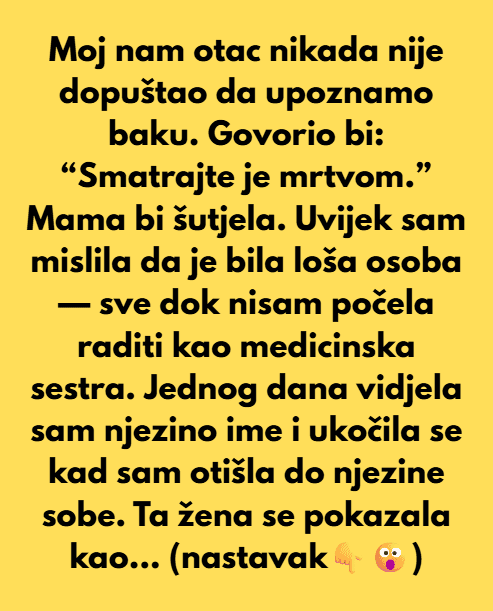 Moj nam otac nikada nije dopuštao da upoznamo baku. Govorio bi: “Smatrajte je mrtvom.” Mama bi šutjela. Uvijek sam mislila da je bila loša osoba — sve dok nisam počela raditi kao medicinska sestra.