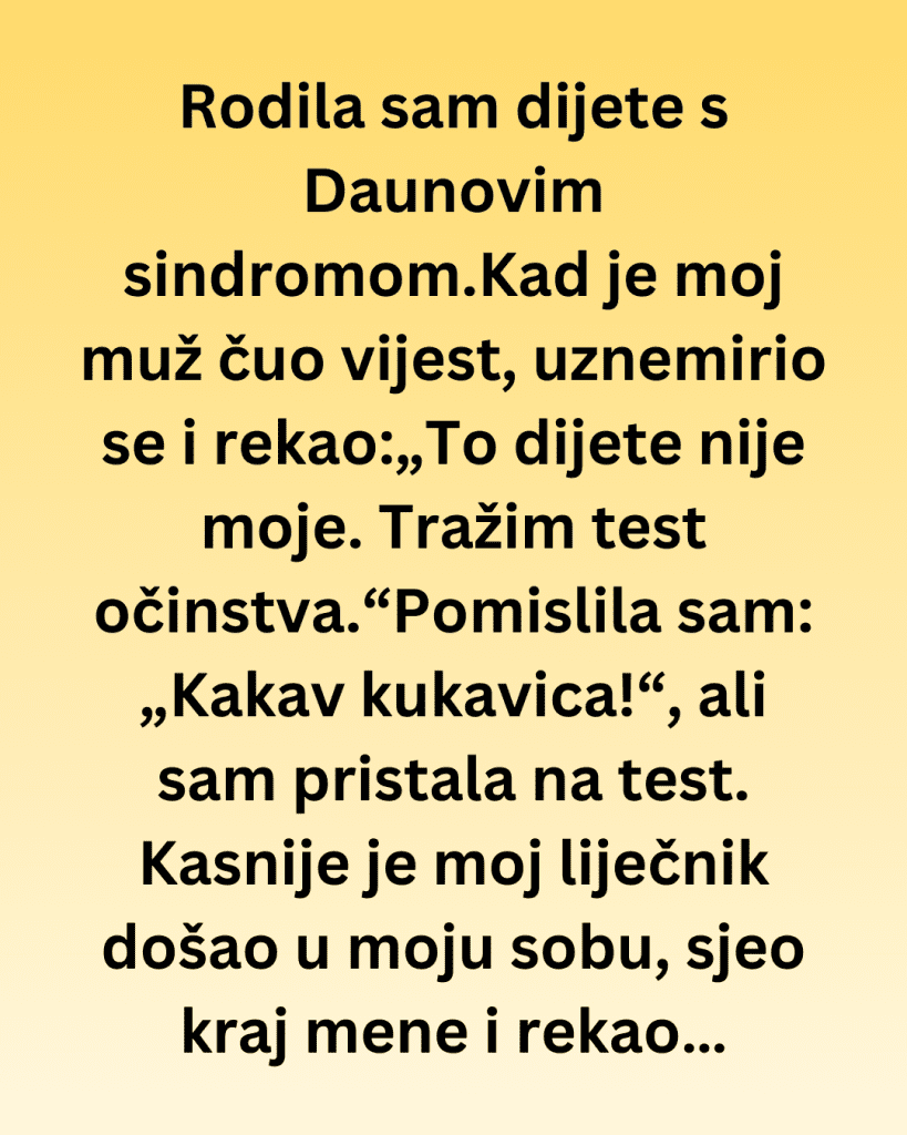 Rodila sam dijete s Downovim sindromom. Čim je moj muž čuo vijest, problijedio je, postao jako nervozan i rekao: „To dijete nije moje. Tražim test očinstva.” Pomislila sam: „Kakav kukavica!”, ali sam pristala na test.