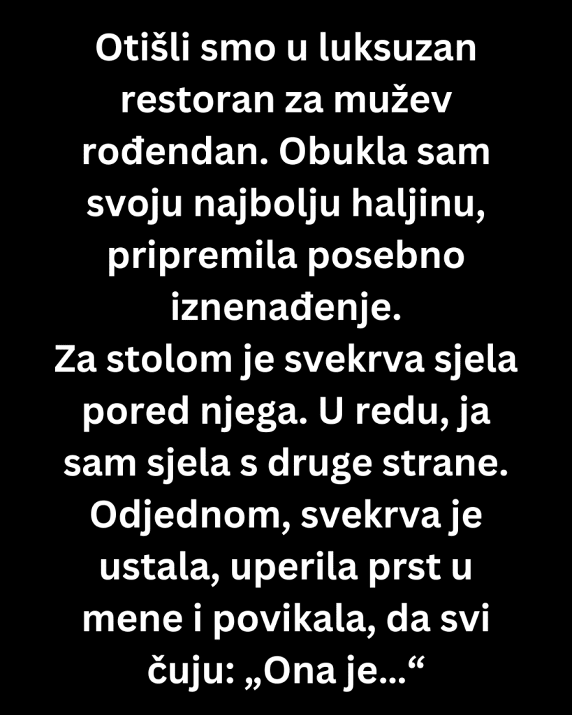 Kad smo stigli, primetila sam da je njegova mama već zauzela mesto pored njega. Nema veze — sela sam s druge strane. Ali pre nego što smo uopšte naručili, ona je ustala, pokazala prstom na mene i povikala: „Ona je tako naporna!“ Zatim je dodala: „Dajmo Luku malo odmora od toga da mu žena stalno visi za vratom!“ Zatim me je direktno pogledala, pokazala na stolicu dalje i rekla: „Pomeri se, dušo. Nek’ mama sedi sa svojim slavljenikom.“