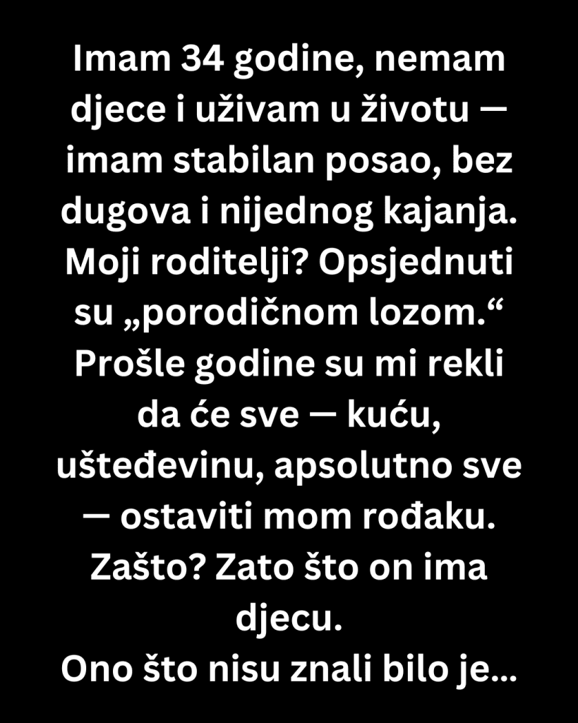 I onda — prošle godine — hladnokrvno su mi rekli da sve svoje ostavljaju mom rođaku. Kuću, štednju, baš sve. Zato što on ima decu, a ja ne. Po njima, roditeljstvo je jedina ulaznica za njihovu verziju “nasleđa”.