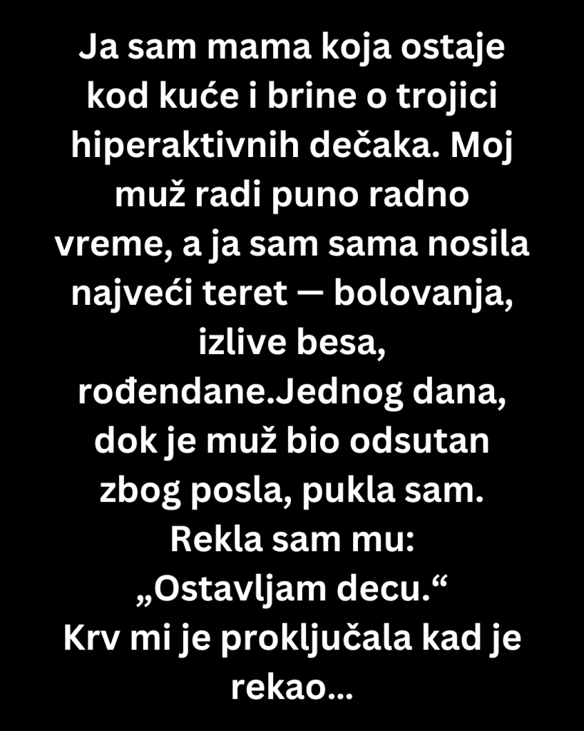 Moj muž radi puno radno vreme, a ja sam se uvek ponosila time što sam ta koja sve drži pod kontrolom. Školski projekti, bolovanja, neprospavane noći, rođendani i emotivni slomovi — sve sam to sama podnosila.