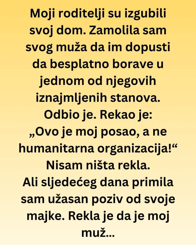 Moji roditelji su u velikim dugovima. Morali su prodati svoju kuću kako bi ih otplatili i sada nemaju gdje da odu. Zato sam zamolila svog muža, koji je vlasnik nekretnina, da im dopusti da privremeno borave u jednom od njegovih stanova besplatno, dok ponovo ne stanu na noge.