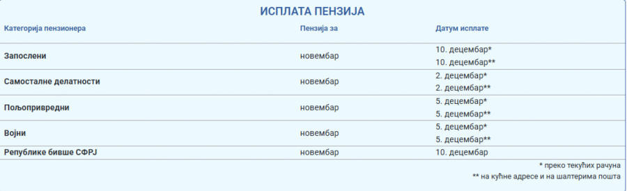 Naime, kako se precizira, isplata penzija za novembar penzionerima iz kategorije zaposlenih bilo da penzije primaju preko tekućih računa, na kućne adrese ili na šalterima isporučnih pošta najavljena je za 10. decembar.
