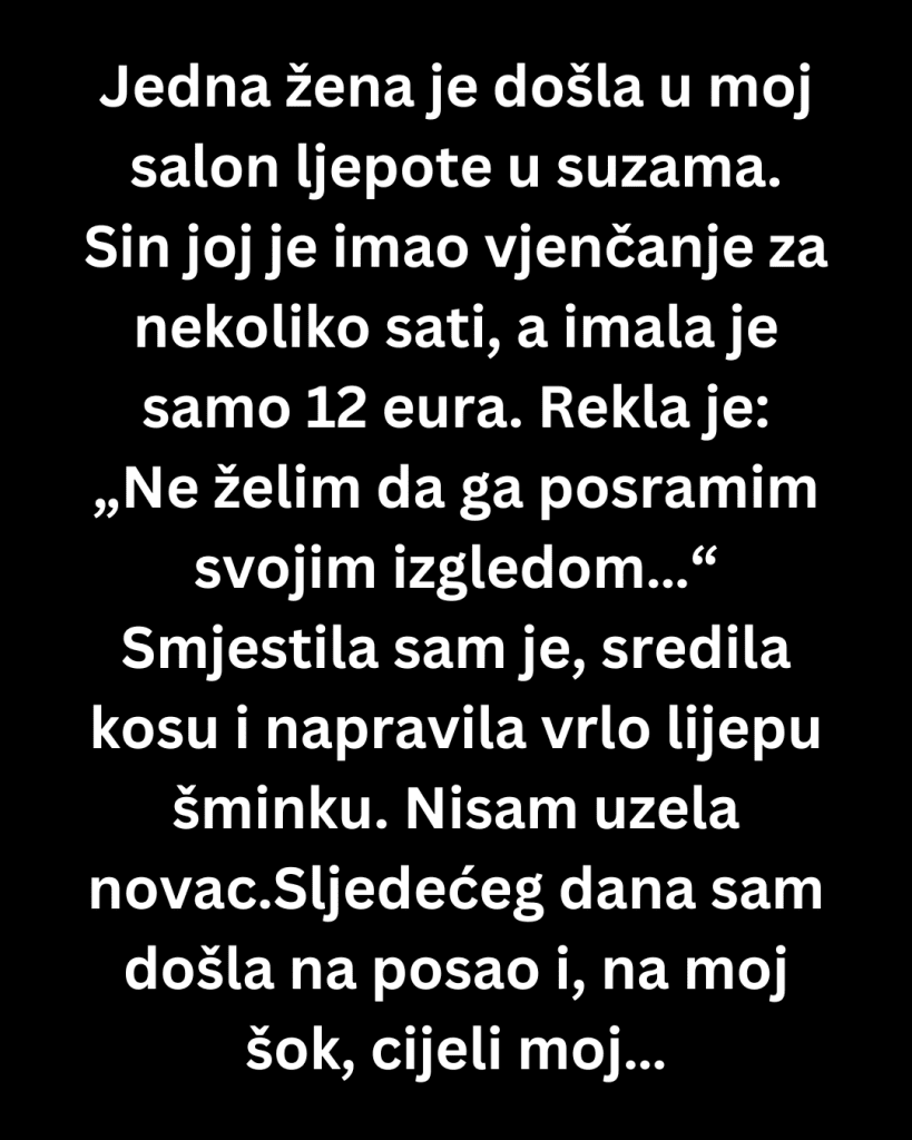 Jedna žena je došla u moj salon ljepote u suzama. Sin joj je imao vjenčanje za nekoliko sati, a imala je samo 12 eura . Rekla je: „Ne želim da ga posramim svojim izgledom…“ Sjela sam je, sredila kosu i šminku besplatno.